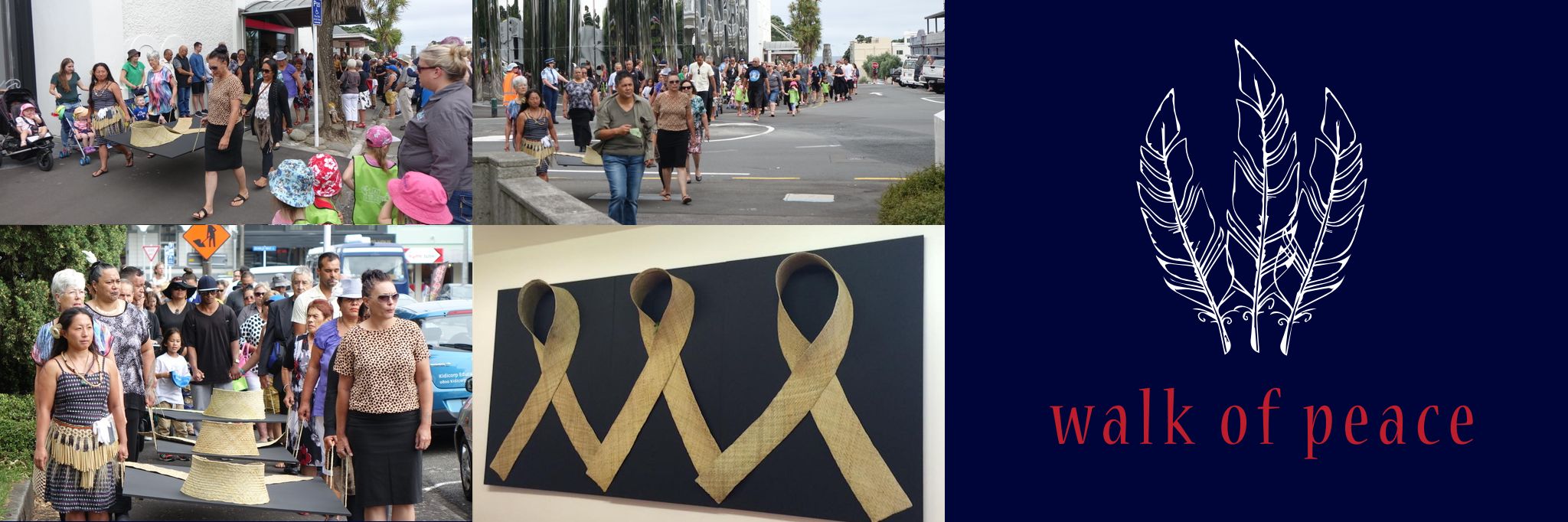 Inspired by an artwork by Parihaka artist Ngahina Hohaia, a Walk of Peace followed the footsteps of prisoners from Parihaka in 1881 along Queen St and past the court house. The procession carried Te Korowai Rangimarie created by four master weavers and Taranaki community members, that was made as part of the Govett-Brewster’s White Ribbon Day support project.