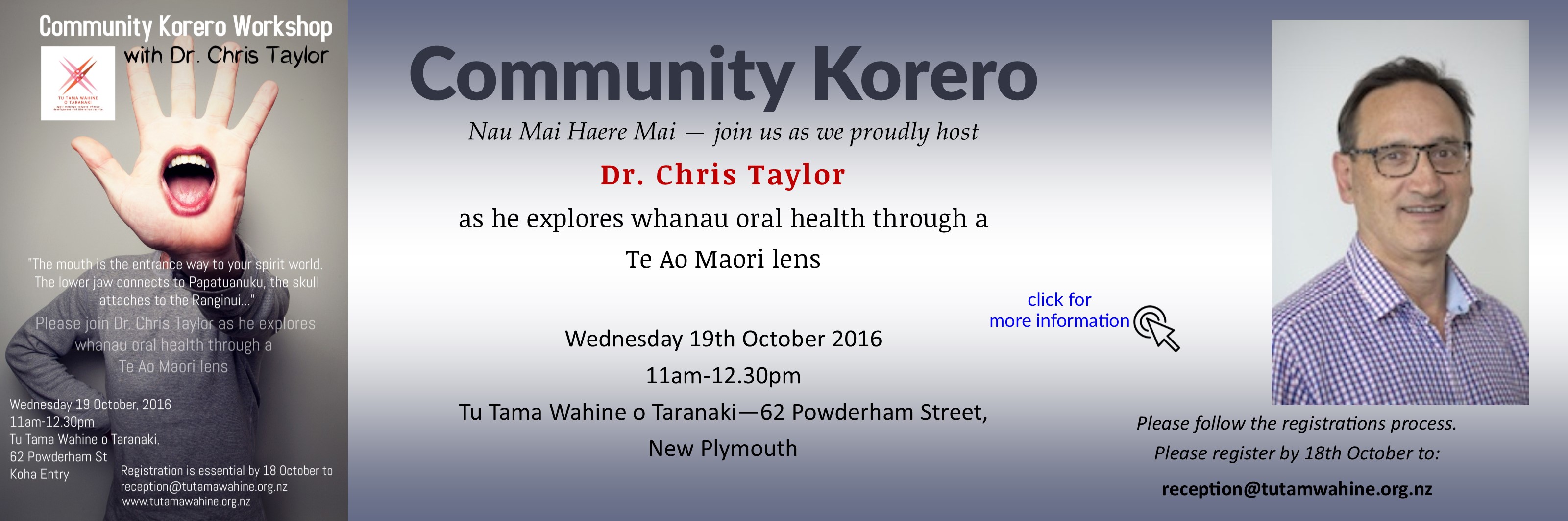 Exploring whanau oral health through a Te Ao Maori lens.Wednesday 19th October 2016 11am-12.30pm at Tu Tama Wahine o Taranaki